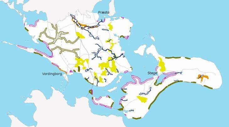 Langs kyster er udstrækningen af de økologiske forbindelser lig med strandbeskyttelseslinjen - og langs mange åer er udstrækningen lig med åbeskyttelseslinjen.